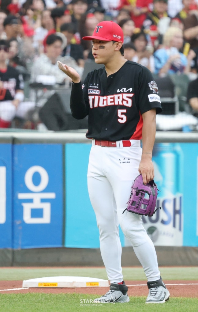 김도영은 5일 부산 사직야구장에서 열린 롯데 자이언츠와 2025 신한 SOL 뱅크 KBO 리그 정규시즌 원정경기에서 팀의 3번 타자 겸 3루수로 선발 출전했다.