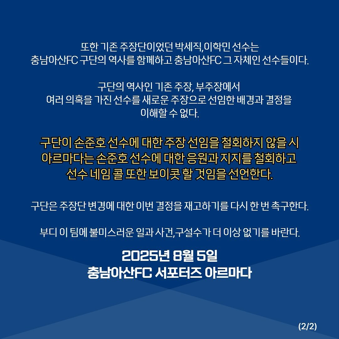 이어 "기존 주장단이었던 박세직, 이학민 선수는 구단 역사를 함께하고 충남아산FC 그 자체인 선수들이다. 구단의 역사인 기존 주장·부주장 대신 여러 의혹을 가진 선수를 새로운 주장으로 선임한 배경과 결정을 이해할 수 없다"며 "구단이 손준호에 대한 주장 선임을 철회하지 않을 시, 아르마다는 손준호 선수에 대한 응원과 지지를 철회하고 선수 네임 콜 또한 보이콧할 것임을 선언한다. 주장단 변경에 대한 결정을 재고하기를 다시 한번 촉구한다. 부디 이 팀에 불미스러운 일과 사건, 구설수가 더 이상 없기를 바란다"고 덧붙였다.