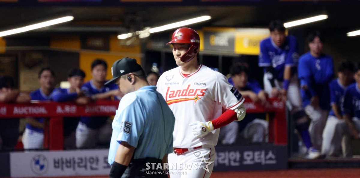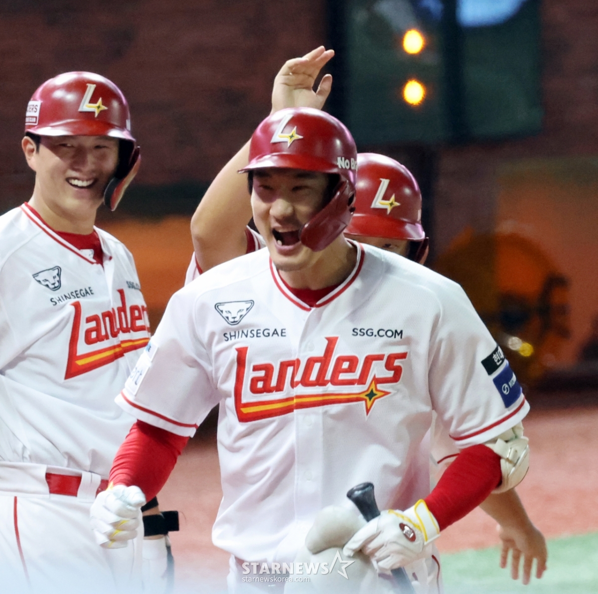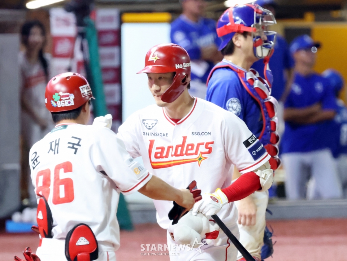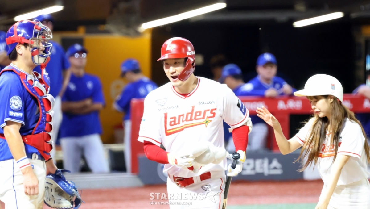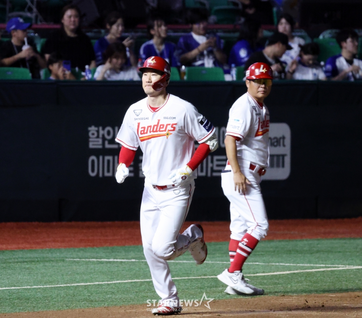 SSG 8번타자 채현우 대타로 나선 오태곤이 6일 인천SSG랜더스필드에서 열린 2025 KBO리그 SSG랜더스와 삼성라이온즈 경기 6회말 2사 1,2루에서 가운데 담장을 넘어가는 역전 3점홈런을 터트린 후 홈인하고 있다. 2025.08.06.