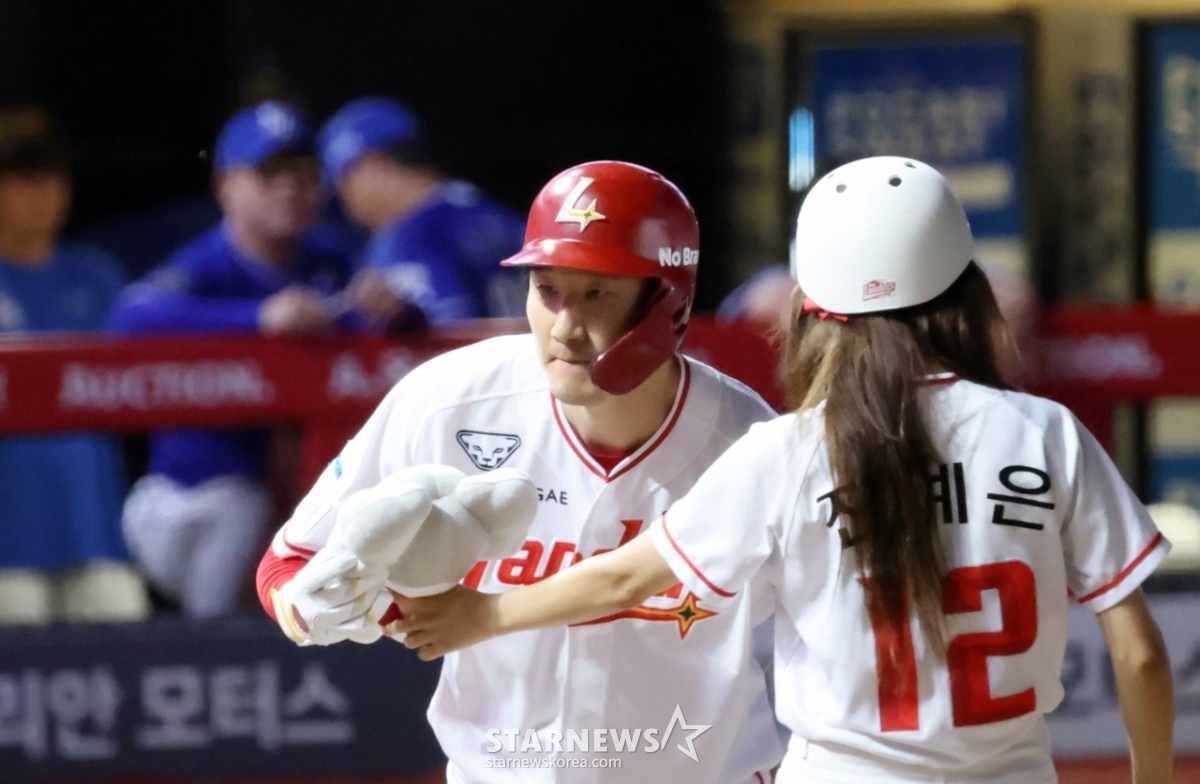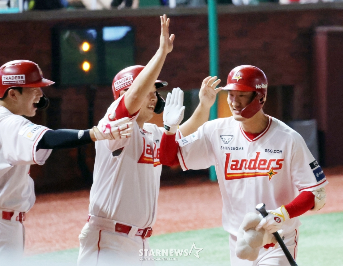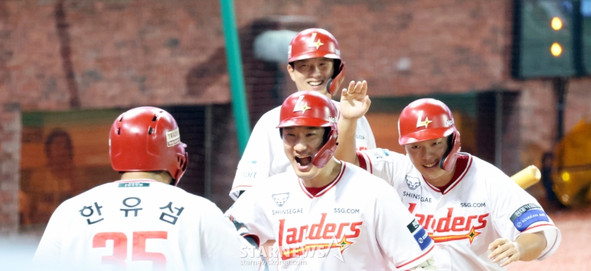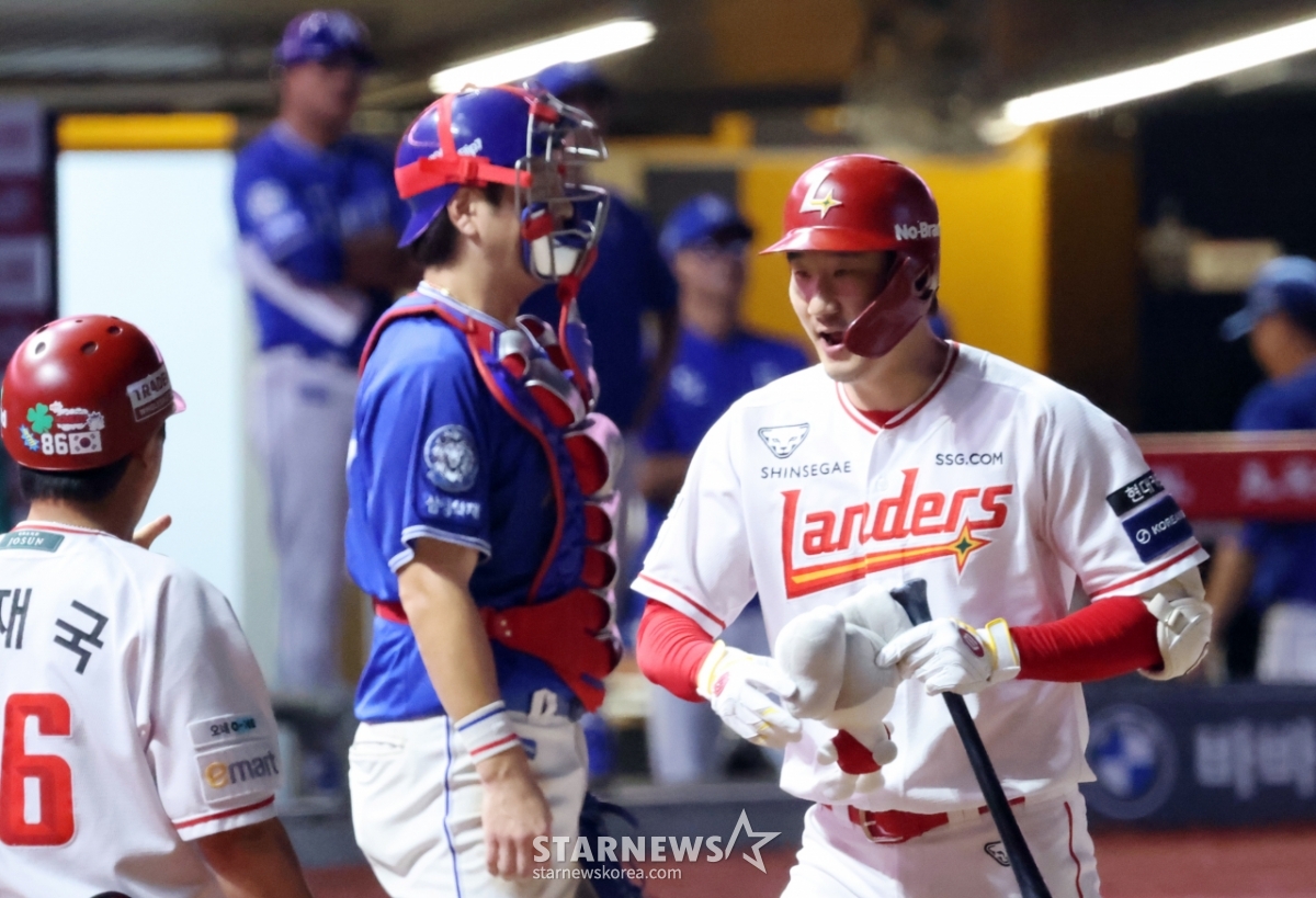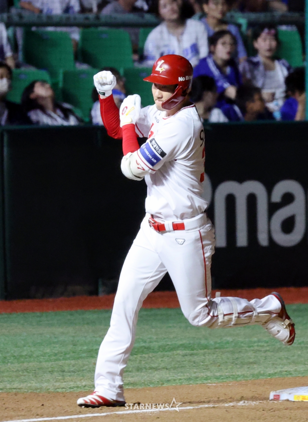 SSG 8번타자 채현우 대타로 나선 오태곤이 6일 인천SSG랜더스필드에서 열린 2025 KBO리그 SSG랜더스와 삼성라이온즈 경기 6회말 2사 1,2루에서 가운데 담장을 넘어가는 역전 3점홈런을 터트린 후 홈인하고 있다. 2025.08.06.