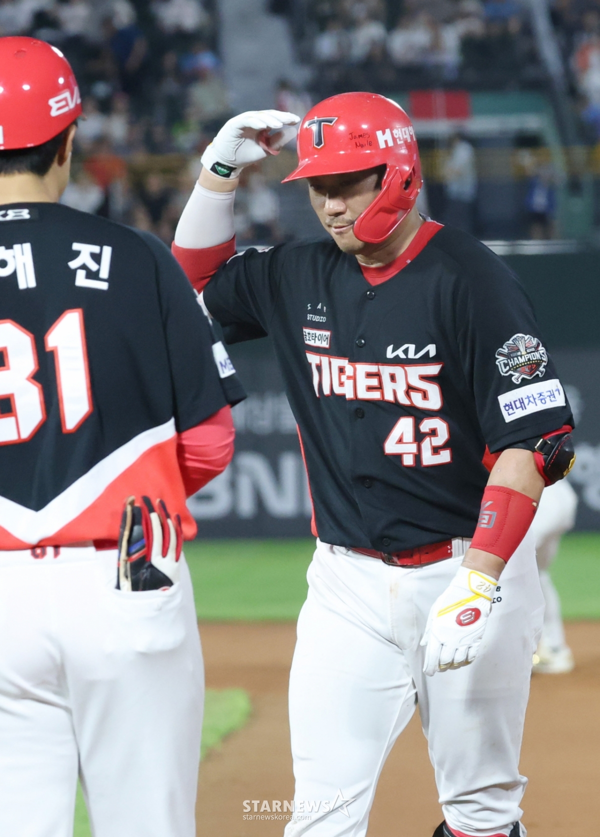 스포츠야구[포토] 김태군 '7회에도 미션 클리어'발행 : 2025.08.06 ・ 21:24부산=김진경 대기자광고삭제2025 신한 SOL Bank KBO리그 롯데 자이언츠 대 KIA 타이거즈 경기가 6일 부산 사직야구장에서 열렸다.KIA 김태군이 7회초 1사에서 좌전 안타를 날리고 출루한 후 윤해진 코치의 환영을 받고 있다.<저작권자 © 스타뉴스, 무단전재 및 재배포 금지>프로야구KBO롯데_자이언츠KIA_타이거즈김도영복귀추천 기사김진경 대기자기자홈좋아요 스포츠-야구의 인기 급상승 뉴스스포츠-야구의 최신 뉴스
