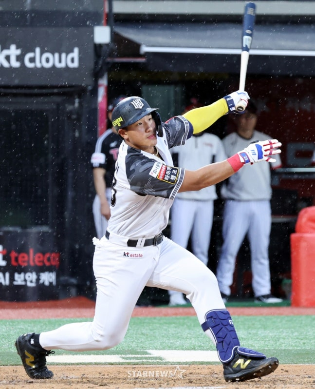 안현민은 9일 수원KT위즈파크에서 열린 2025 신한 SOL Bank KBO리그 정규시즌 삼성 라이온즈와 홈 경기에서 우익수 및 3번 타자로 선발 출전해 4타수 무안타 4삼진으로 침묵했다.