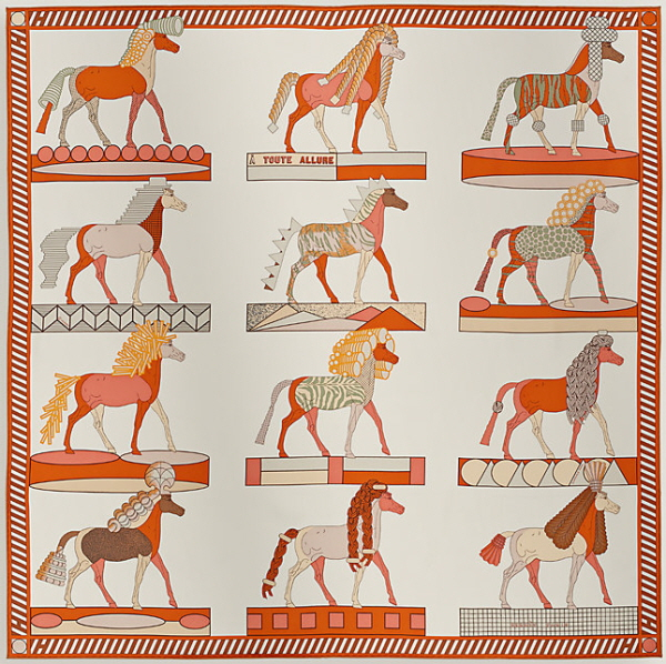 에르메스는 시그니처 '카레(Carre)' 실크 스카프에 말과 기수, 마구를 주제로 한 디자인이 끊임없이 등장한다. 듀크와 마차부가 그려진 에르메스의 상징적인 로고는 오늘날에도 브랜드의 뿌리를 말해준다.