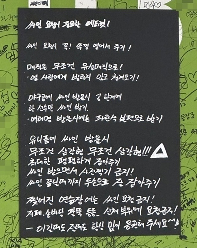 이런 가운데 최근 '대투수' 양현종(37·KIA 타이거즈)가 홈구장(광주-기아 챔피언스 필드) 주차장 기둥에 사인 에티켓 안내문(사인 요청시 중요한 에티켓!)을 부착해 화제가 됐다. KIA 구단 관계자는 "양현종 선수가 지난 달 직접 써서 붙였다"고 확인했다.