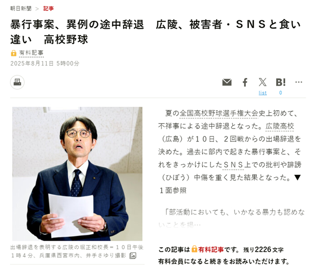 지난 5일 개막한 제107회 일본 전국고교야구선수권대회(여름철 고시엔)는 어수선한 분위기다. 10일 야구부 폭행 사태가 소셜 미디어를 통해 알려져 논란이 된 히로시마의 야구 명문 고료(広陵)고가 대회 도중 사퇴를 결정했기 때문이다. 폭행 사건으로 인한 대회 도중 사퇴는 여름철 고시엔 역사상 최초의 일이다.