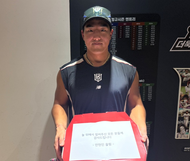 겉보기에는 거칠 것 없던 근육질 야수(野獸)가 모두를 챙기는 순박한 마음씨로 반전 매력을 선보였다. 개인 첫 한 시즌 100안타와 첫 월간 MVP 수상을 기념해 구단 직원들에게 피자를 돌린 KT 위즈 괴물 안현민(22)이 그 주인공이다.