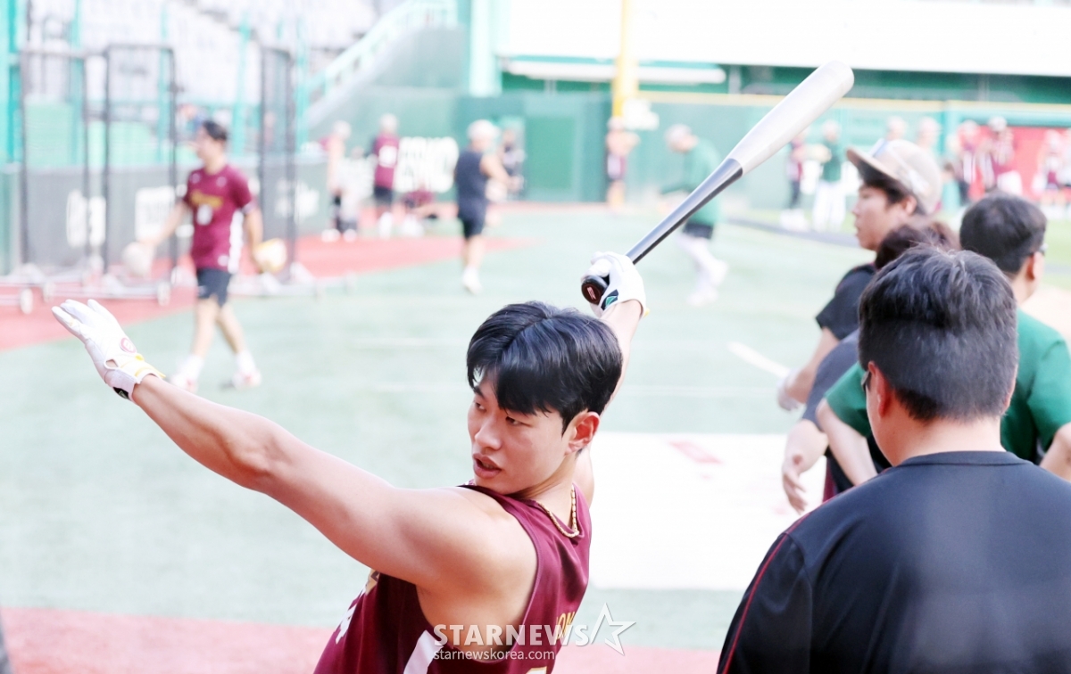 '120억 다년계약'으로 야구팬들을 놀라게 했던 키움의 간판타자 송성문이 20-20클럽에 홈런 1개, 도루 1개만을 남겨두며 올시즌 처음으로 '20-20클럽 오프닝'에 도전하고 있다. 12일 인천SSG랜더스필드에서 열리는 키움히어로즈와 SSG랜더스 경기에 앞서 공 하나하나에 집중하는 모습, 무더위에도 미소를 잃지않는 얼굴에서 그의 도전이 곧 이루어질것을 예감한다. 2025.08.12.