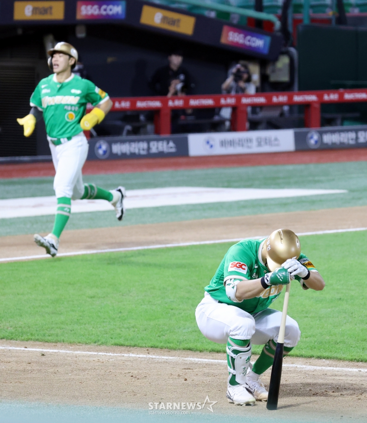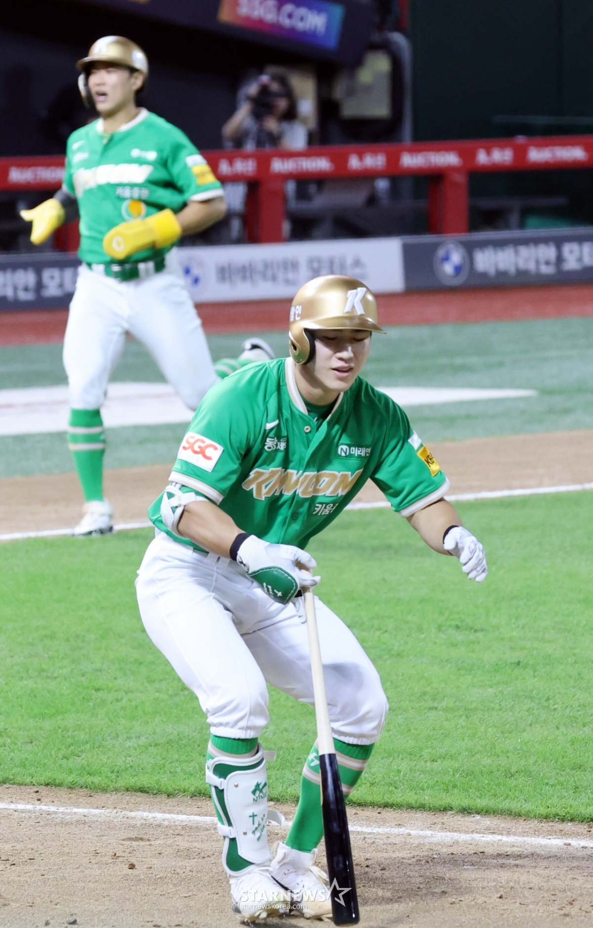 키움 이주형이 12일 인천SSG랜더스필드에서 2025KBO리그 키움히어로즈와 SSG랜더스 경기 6회초 2사 만루에서 대타로 나와 노경은은 초구를 밀어쳤지만 좌익수 에레디아에 잡히자 주저앉고 있다.2025.08.12.