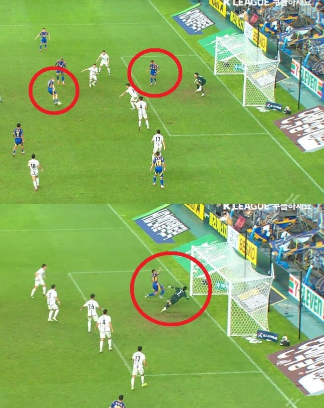 문제는 중계 화면상 정강민은 논란의 여지가 없을 만큼 온사이드 위치였다는 점이다. 근처에 있던 다른 천안 수비수와는 경합 상황으로 볼 여지가 있었지만, 이미 반대편에 또 다른 천안 최종 수비수가 정강민보다 명백히 앞에 위치했기 때문. 굳이 세밀하게 가상선을 그어보지 않아도, 그라운드 위 잔디 색만으로도 확인이 가능할 정도였다.
