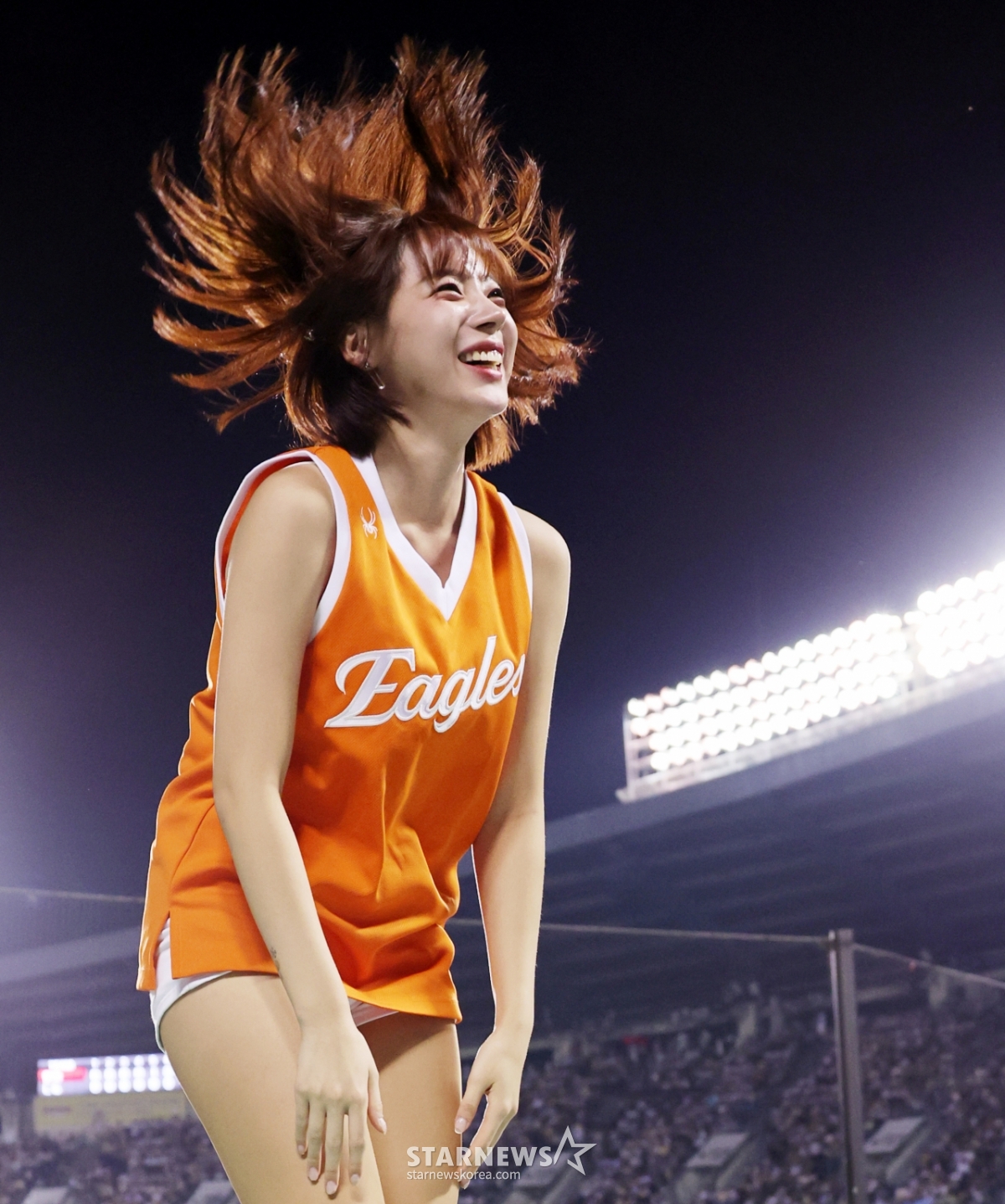 한화치어리더 하지원이 8일 잠실구장에서 열린 한화이글스와 LG트윈스 경기에서 신나게 독수리응원을 펼치고 있습니다.