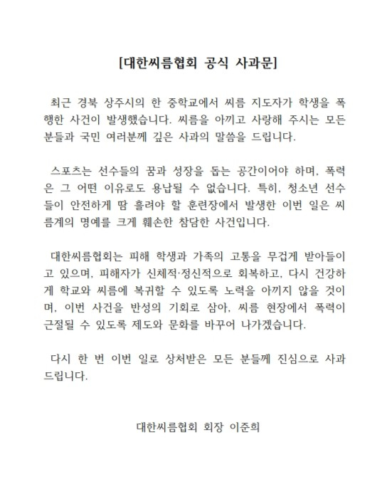 이준희 대한씨름협회장은 14일 공식 홈페이지를 통해 "최근 경북 상주시의 한 중학교에서 씨름 지도자가 학생을 폭행하는 사건이 발생했다"며 "씨름을 사랑하는 모든 분과 국민 여러분께 깊은 사과의 말씀을 드린다"고 밝혔다.