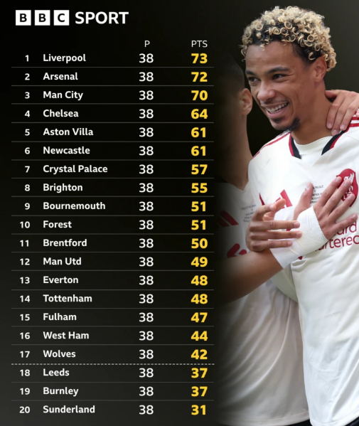 다만 우승권은 역대급으로 치열할 것이라 봤다. 다음 시즌 EPL 상위권에는 아스널, 맨체스터 시티, 첼시가 오를 것이라 전망했다. 2위 아스널(72점)과 1위 리버풀의 승점 차이는 1점에 불과하다. 맨시티(70점)가 아스널에 승점 2 밀린 3위, 첼시(64점)가 4위를 차지할 것이라 예측했다.