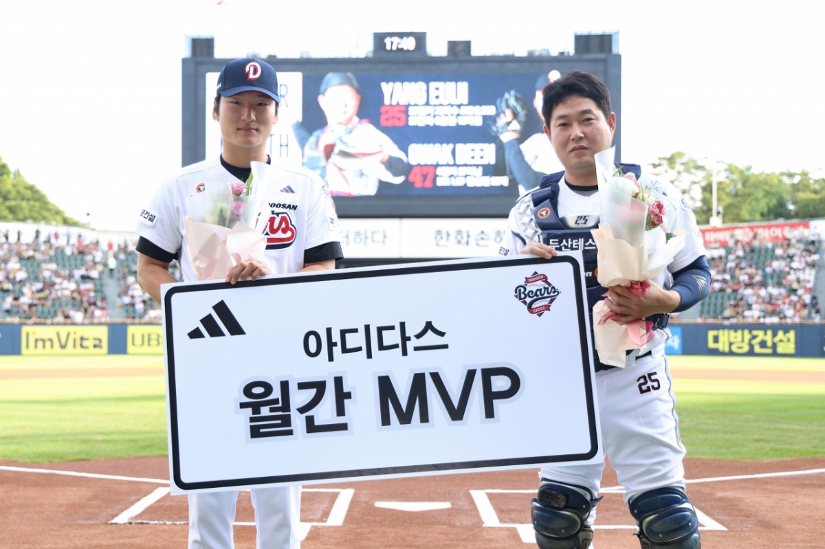월간 성적을 기준으로 선정한 아디다스 7월 MVP는 야수 양의지, 투수 곽빈이다.