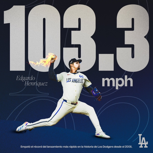 다저스 구단은 17일(한국시간) 공식 SNS를 통해 "에드가르도가 시속 103.3마일(약 166㎞)을 던지며 2008년 이후 다저스 구단 역사상 가장 빠른 구속과 타이를 이뤘다"고 전했다.
