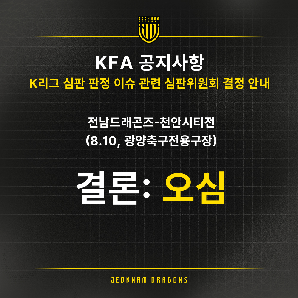 가장 최근 대한축구협회 심판위원회가 직접 '오심'으로 결론 내린 전남 드래곤즈 역시 마찬가지다. 전남 구단은 천안시티전 이후 내부 보고를 거쳐 축구협회에 공문을 보내 판정 관련 이의를 정식으로 제기했다. 명백한 온사이드를 오프사이드로 선언해 득점을 취소시킨 장면만이 아니었다. 이날 팔꿈치에 얼굴을 가격당해 결국 부상 교체까지 당했는데도 상대가 퇴장이 아닌 경고에 그친 판정, 추가시간 상당 시간이 비디오 판독과 온 필드 리뷰 등에 소요됐는데도 납득할 만한 추가시간이 더 주어지지 않은 결정 등까지 담아 공문을 보냈다.