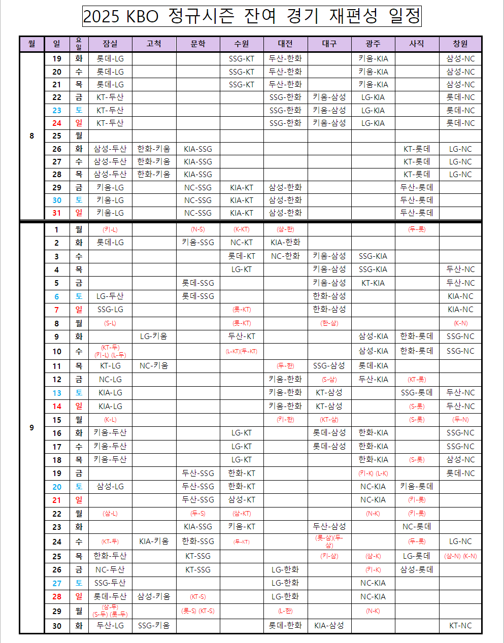 2025 KBO 정규시즌 잔여 경기 재편성 일정. /표=KBO 제공
