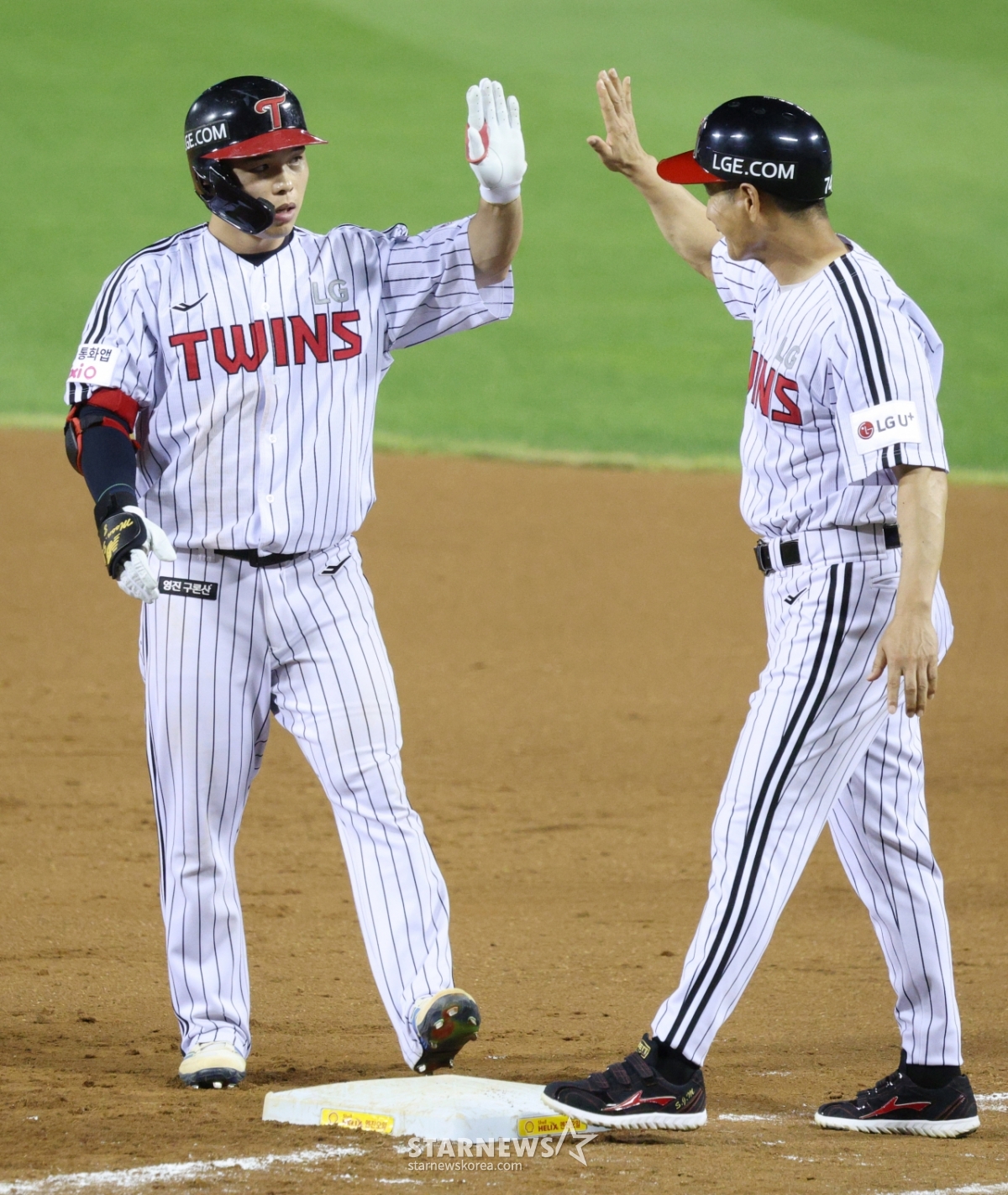 스포츠야구[포토] 문성주 '가을아 빨리 와라'발행 : 2025.08.19 ・ 20:12잠실=김진경 대기자2025 신한 SOL Bank KBO리그 LG 트윈스 대 롯데 자이언츠 경기가 19일 서울 잠실야구장에서 열렸다.LG 문성주가 5회말 1사 2,3루에서 2타점 적시타를 날리고 출루한 후 송지만 코치의 환영을 받고 있다.<저작권자 © 스타뉴스, 무단전재 및 재배포 금지>프로야구KBO시구승요승리요정치어리더추천 기사김진경 대기자기자홈좋아요 스포츠-야구의 인기 급상승 뉴스스포츠-야구의 최신 뉴스