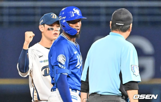 다음 타자 르윈 디아즈가 오른쪽으로 잘 맞은 타구를 날렸다. 하지만 낙구 지점을 찾은 우익수 최원준이 펜스에 붙어 타구를 잡아냈다. 하지만 다시 공을 놓치면서 구자욱은 3루로, 디아즈는 2루로 향했다. NC 벤치에서 비디오 판독을 요청했으나 결과는 그대로였다.