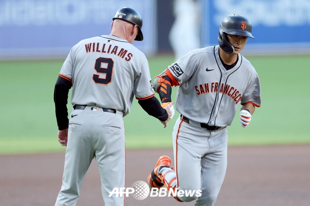 이정후(오른쪽)가 20일(한국 시각) 미국 캘리포니아주 샌디에이고에 위치한 펫코 파크에서 펼쳐진 샌디에이고 파드리스와 2025 미국 프로야구 메이저리그(MLB) 정규시즌 원정경기에 1번 타자 겸 중견수로 선발 출장, 1회 첫 타석부터 홈런포를 터트린 뒤 맷 윌리엄스 3루 코치와 하이파이브를 하고 있다. /AFPBBNews=뉴스1