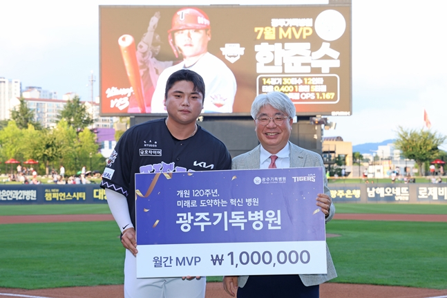 KIA 타이거즈 포수 한준수(26)가 광주기독병원에서 시상하는 7월 월간 MVP에 선정됐다.