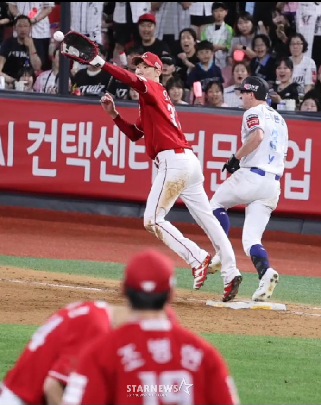 로하스를 대신한 KT 외국인타자 스티븐슨이 19일 수원KT위즈파크에서 열린 SSG랜더스와 KT위즈 경기에서 9회말 최선을 다하는 플레이 하나로 극적인 끝내기 득점의 주인공이 됐다.