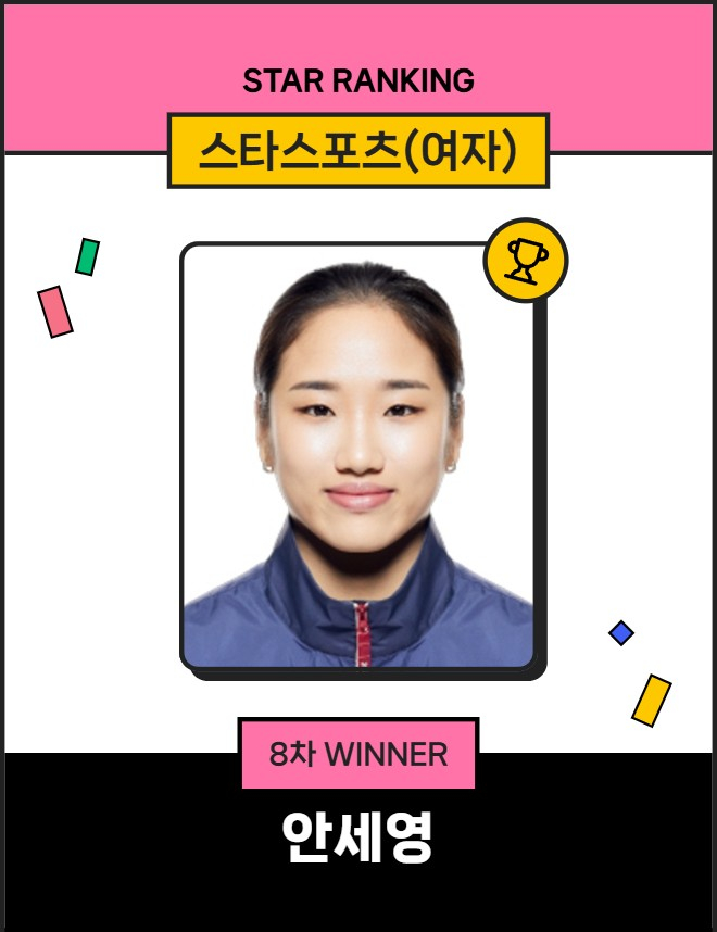안세영은 14일 오후 3시 1분부터 21일 오후 3시까지 일주일 동안 진행한 스타랭킹 스타스포츠 여자 8차 투표에서 8400표를 얻으며 신유빈(2257표)을 두 배 넘는 수치로 제치고 1위에 올랐다. 2연속 가장 많은 득표를 기록했다. 앞선 7차 투표에서 1만 4222표로 처음으로 1위에 오른 안세영은 8차 투표에서도 신유빈보다 많은 표를 받았다.