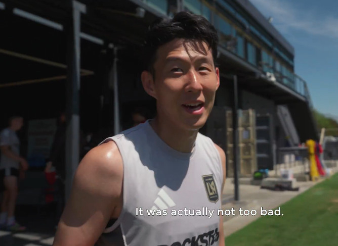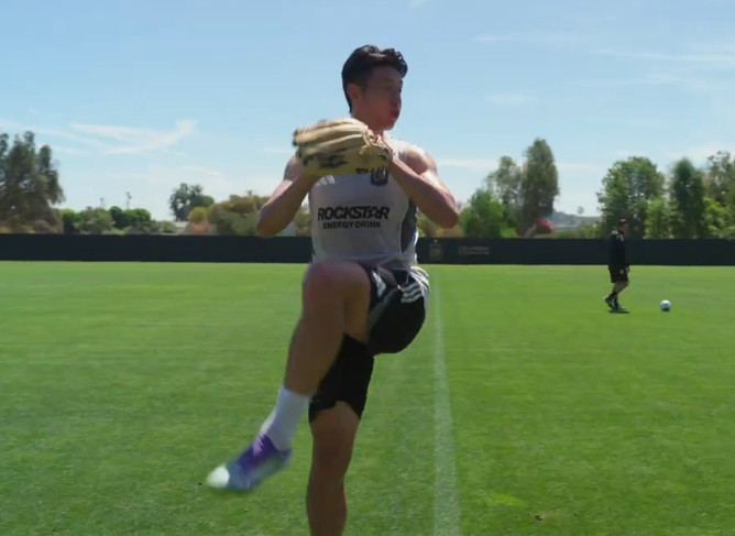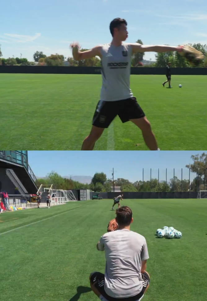 LA FC 수비수 라이언 홀링스헤드는 포수를 자처해 손흥민의 연습을 도왔다. 볼을 받아본 그는 "투구 자세, 몸 회전 모두 좋다. 자신감이 넘친다"고 좋게 평했다.