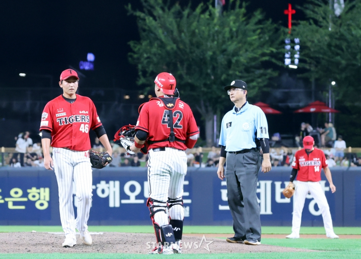 스포츠야구[한번에쓱]'아웃카운트 하나 없이 헤드샷이라니....' 5회초 등판 김정엽발행 : 2025.08.22 ・ 20:23광주=강영조 선임기자광고삭제KIA 우완불펜 김정엽이 22일 광주KIA챔피언스필드에서 LG트윈스와 KIA타이거즈의 경기 5회초 등판해 무사 1루에서 이주헌에 헤드샷을 범한 후 퇴장당하고 있다. 2025.08.22.5회초 이의리 이어 등판첫타자 최원영은 볼넷.....이주헌의 머리를 맞춘 김정엽다행히 부상은 아닌 이주헌갈때 가더라도 이주헌에 사과는 하고 가야지!<저작권자 © 스타뉴스, 무단전재 및 재배포 금지>김정엽헤드샷이주헌등판광주챔피추천 기사강영조 선임기자기자홈좋아요 스포츠-야구의 인기 급상승 뉴스스포츠-야구의 최신 뉴스