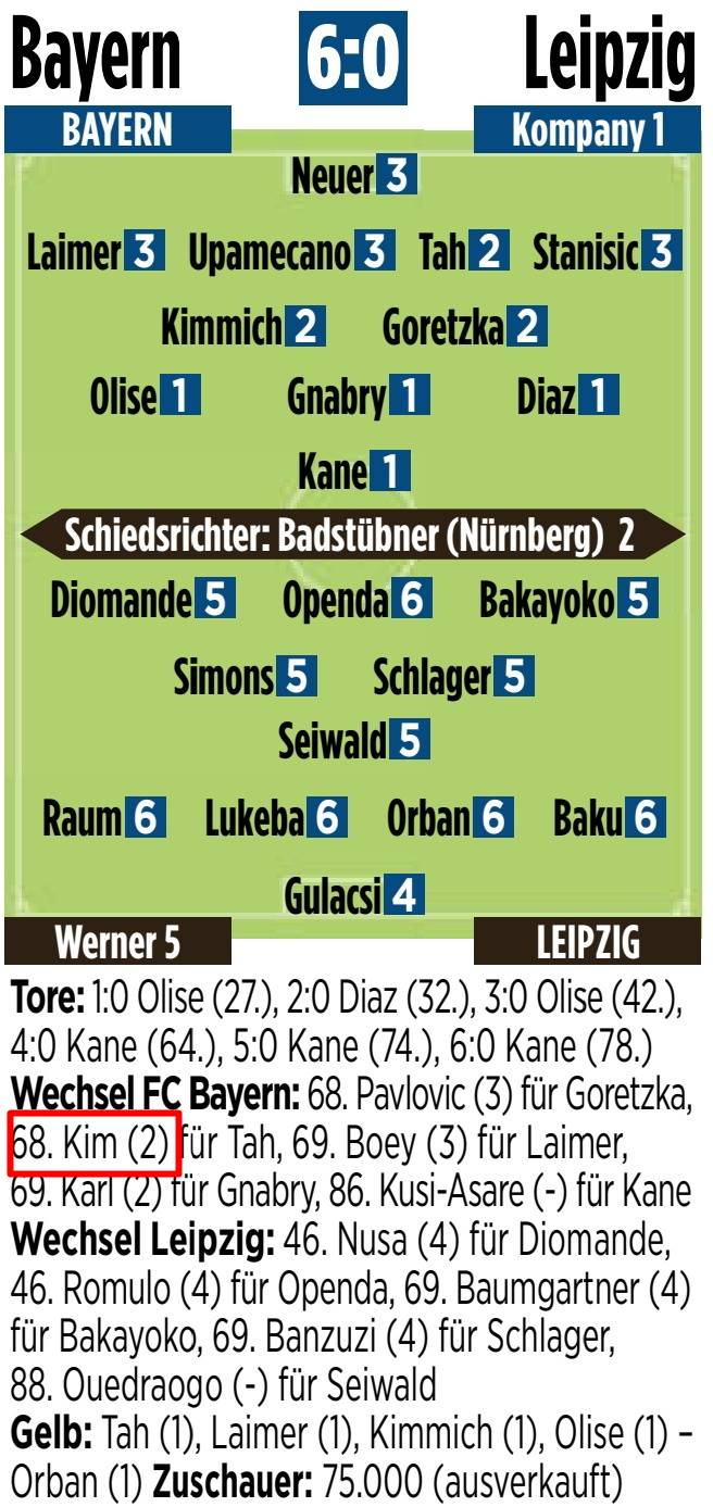 뮌헨은 4-2-3-1 포메이션을 가동했다. 해리 케인이 최전방에 서고 루이스 디아스, 세르주 그나브리, 마이클 올리세가 2선에 배치됐다.