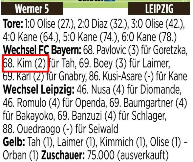 김민재는 뮌헨이 4-0으로 앞선 후반 22분 타를 대신해 경기장에 투입됐다. 후반 32분 라이프치히 후방에서 센터서클 쪽으로 공을 찔러줬다. 여기서 김민재는 쌩쌩한 체력을 자랑하듯 빠르게 공을 가로챘고 3명의 라이프치히 수비수를 달고도 약 50m를 질주해 페널티박스 안까지 향했다. 함께 뛰어온 해리 케인에게 살짝 흘려줬고, 케인이 가볍게 골문을 두드리며 첫 도움을 올렸다.