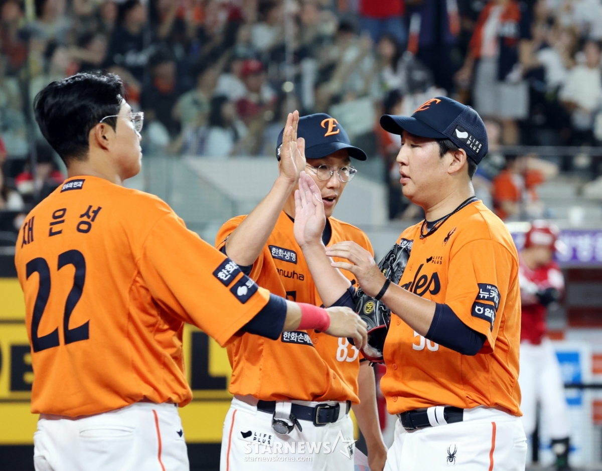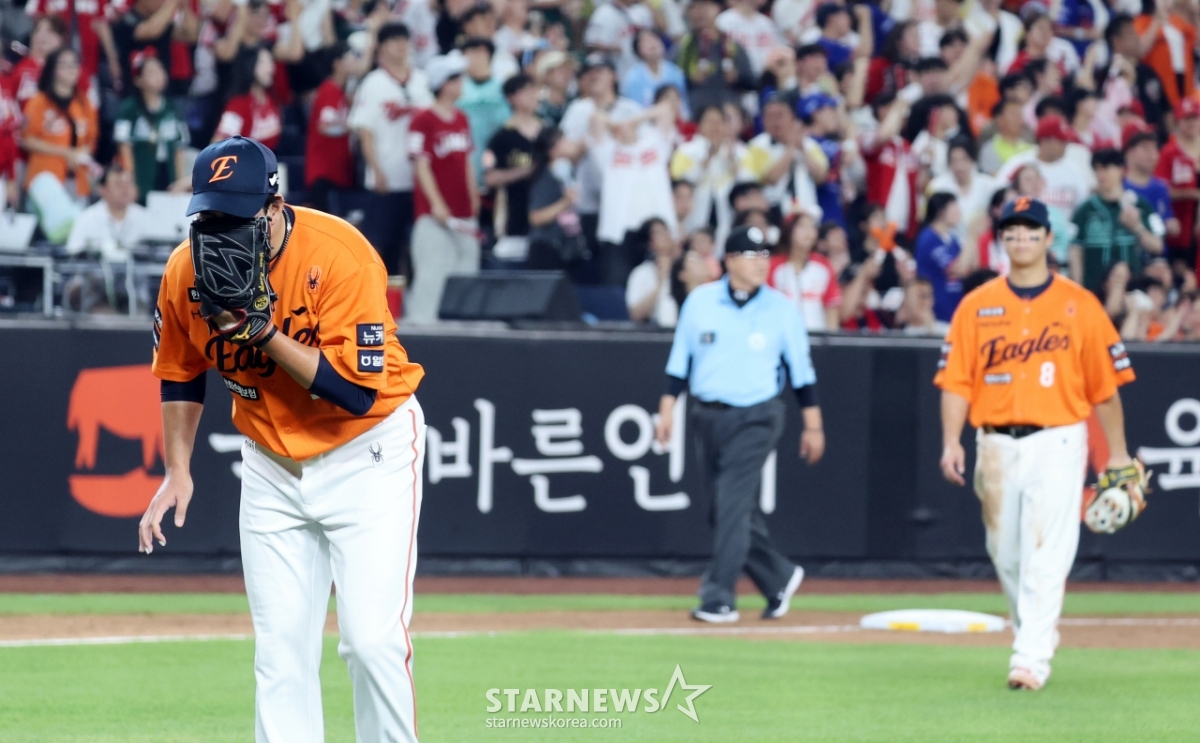한화 우완불펜 박상원이 23일 대전한화생명볼파크에서 열린 2025KBO리그 한화이글스와 SSG랜더스 경기 7회초 무실점 피칭을 펼친 후 글러브로 가린채 자축하고 있다. 2025.08.23.
