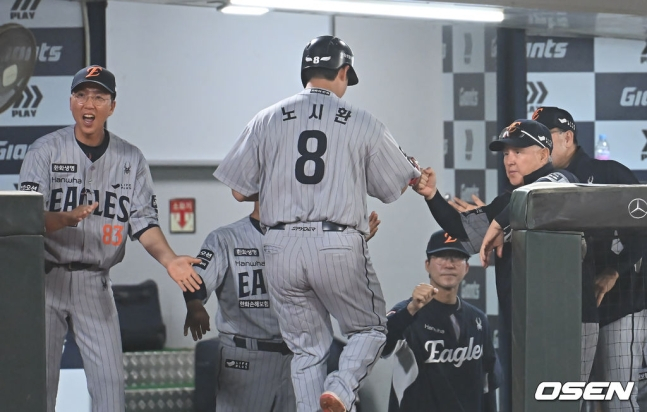 그러나 익숙지 않은 상황에 노시환도 어려움을 나타냈다. 1구는 볼이 됐고 2구 시속 149㎞ 투심 패스트볼에 번트를 시도했지만 파울이 됐다. 다행스럽게도 이후 상대 미치 화이트의 제구가 흔들렸고 폭투 이후 볼넷을 얻어내 1루에 출루했다. 이후 채은성의 2타점 적시타, 최재훈의 쐐기 1타점 희생플라이까지 더해 5-0 승리하며 연패 탈출에 성공했다.