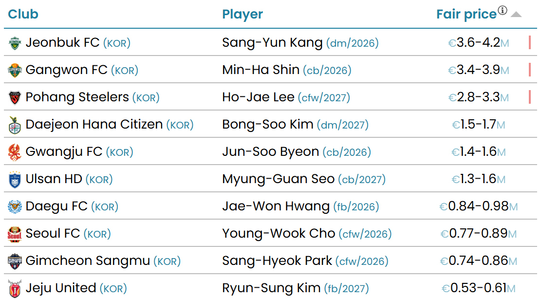 한편 강상윤에 이어 K리그 시장가치 2위인 2005년생 센터백 신민하(20·강원FC)는 다음 달 칠레에서 개막하는 2025 FIFA 20세 이하(U-20) 월드컵 대비 최종 국내 소집 훈련에 참여한다. 신민하의 현재 시장가치는 340만~390만 유로(약 56억~64억원)로 평가받는다. 지난달 발표 당시엔 K리그 전체 3위였으나 최근 2위로 올라섰다.