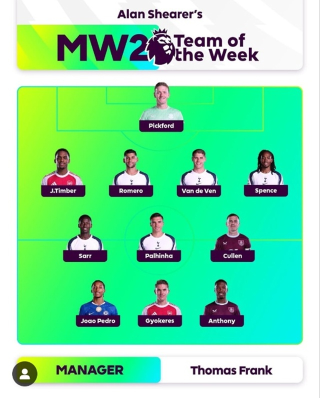 프리미어리그 사무국은 26일(한국시간) 공식 홈페이지 및 SNS를 통해 잉글랜드 프리미어리그(EPL) 2라운드에서 최고의 활약을 펼친 선수 11명을 뽑는 '이주의 팀'을 발표했다. 잉글랜드 축구 레전드 앨런 시어러가 선정한 가운데, 토트넘 선수는 무려 5명이나 들어갔다.