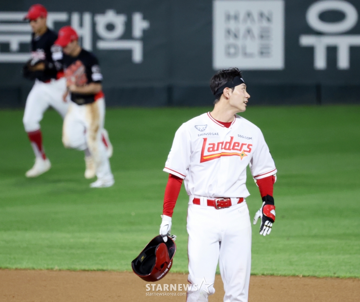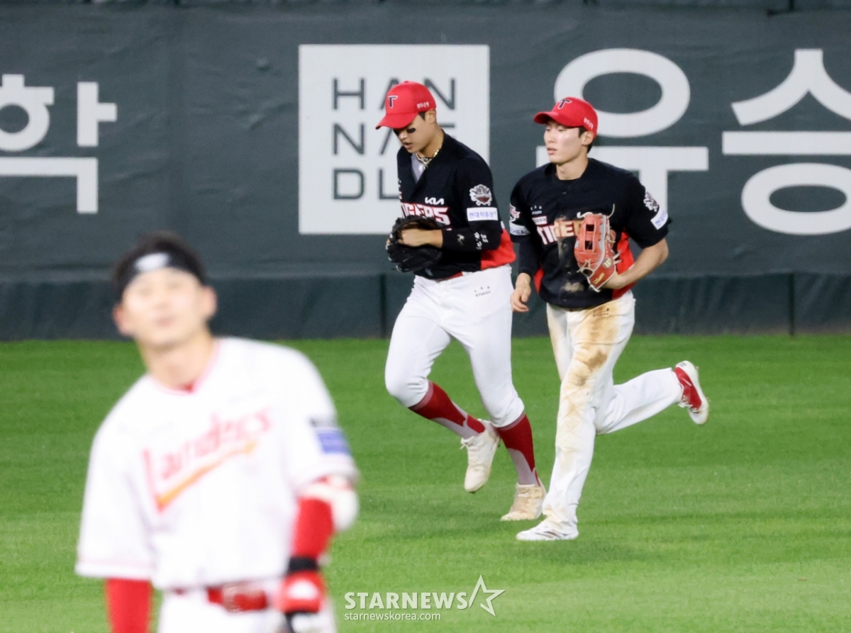 KIA 중견수 김호령이 27일 인천SSG랜더스필드에서 SSG랜더스와 KIA타이거즈의 경기 9회말 2사 1루 SSG 안상현의 좌중간을 가르는 타구를 호수비로 잡아내며 끝내기안타를 지운 후 더그아웃으로 향하고 있다. 2025.08.27.
