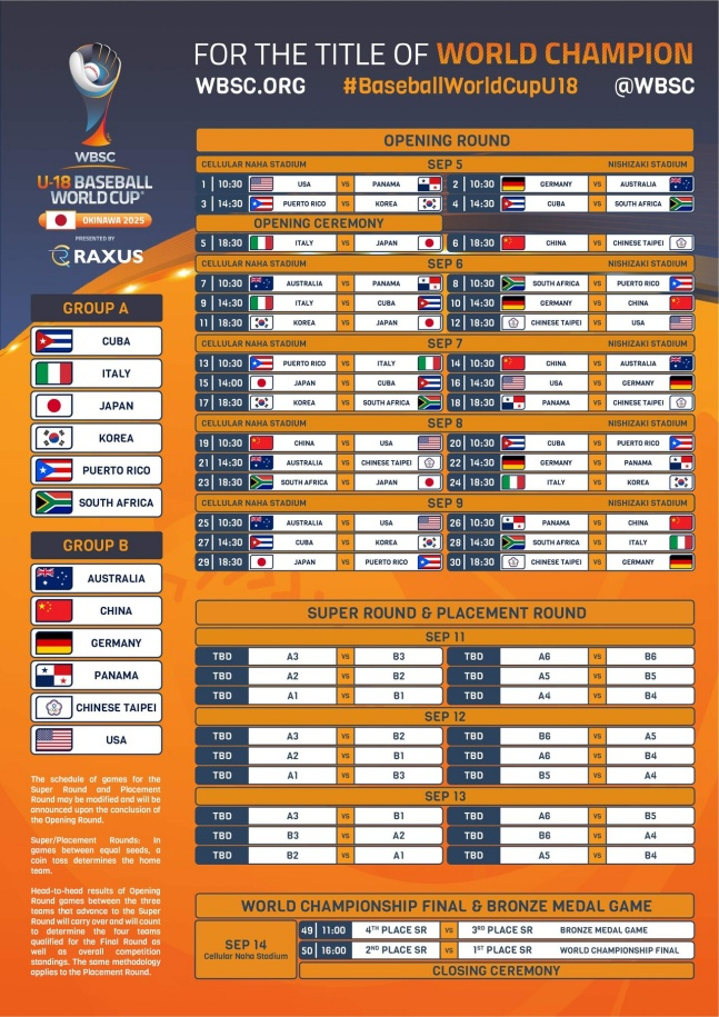 이번 대회는 한국을 비롯해 일본, 대만, 미국, 쿠바 등 총 12개국이 참가한다. 한국은 일본, 쿠바, 이탈리아, 푸에리토리코, 남아공과 함께 A조에 편성됐으며, 조별리그 상위 3개국이 슈퍼라운드에 진출하게 된다. 오프닝라운드(슈퍼라운드 진출 팀 상대 전적)와 슈퍼라운드(3경기) 성적을 합산하여, 메달 결정전에 나서 최종 순위가 가려지게 된다. 한국은 2017년 캐나다 썬더베이에서 준우승을 차지한 바 있고, 직전 대회인 2022년에는 4위에 머물렀다.