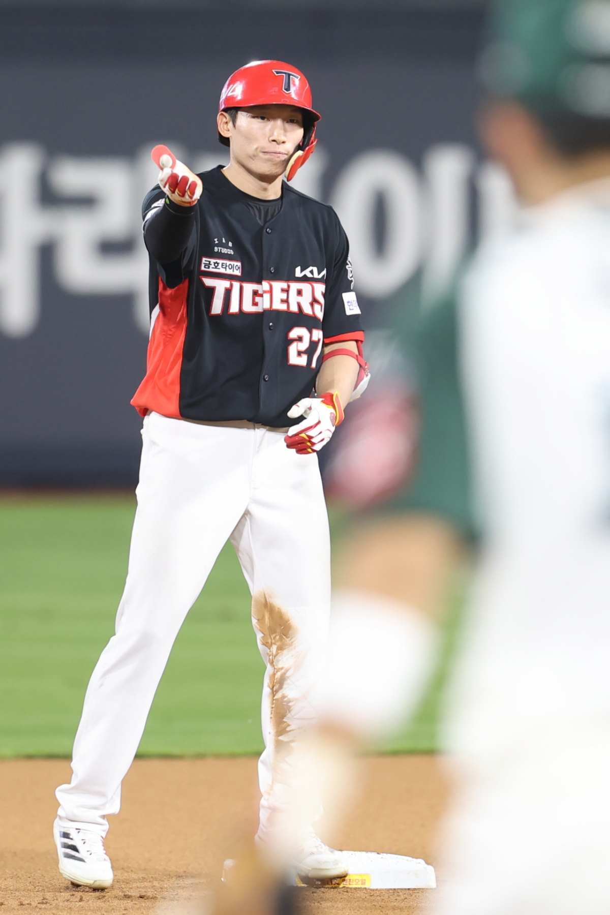김호령의 방망이는 6회부터 불을 뿜었다. 팀이 0-1로 뒤진 상황. 김호령은 선두타자로 나서 KT 선발 패트릭을 상대로 우중간 2루타를 터트렸다. 이어 후속 김선빈의 우중간 적시타 때 홈인, 승부를 원점으로 돌리는 득점을 올렸다.