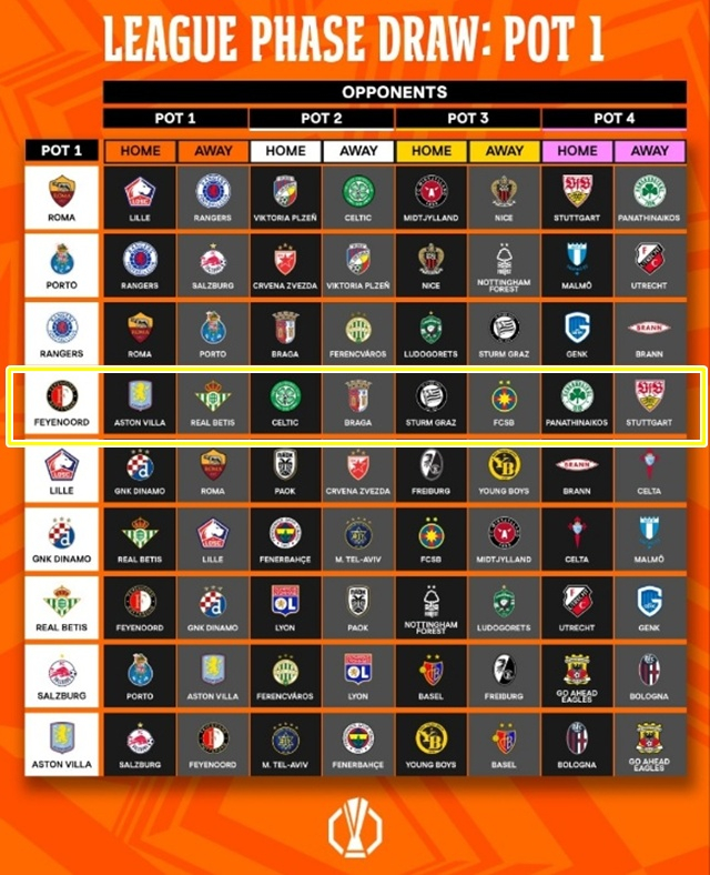 먼저 황인범의 소속팀 페예노르트(네덜란드)는 쉽지 않은 일정을 받았다. 강팀들을 줄줄이 만난다. 페예노르트는 잉글랜드 애스턴빌라와 홈에서 마주하고, 이외에도 레알 베티스(스페인), 셀틱(스코틀랜드), 브라가(포르투갈), 슈투름그라츠(오스트리아), FCSB(루마니아), 파나티나이코스(그리스), 슈투트가르트(독일)를 상대한다.