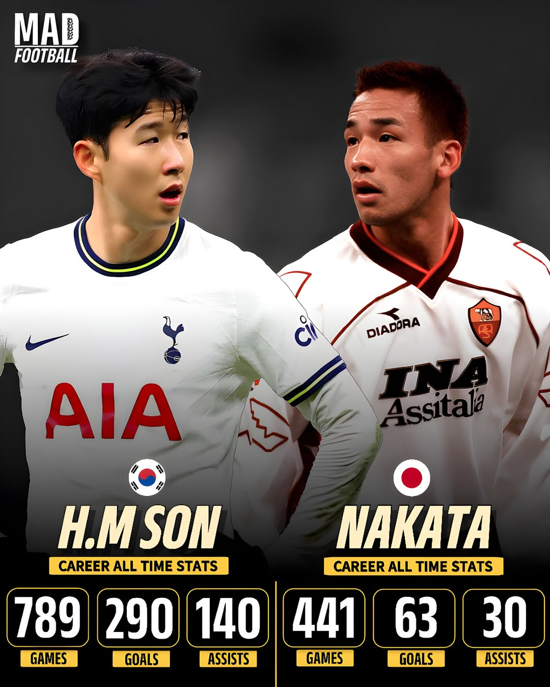 다만 나카타는 불과 29세에 은퇴할 만큼 전성기가 짧았던 데다, 손흥민은 유럽축구연맹(UEFA) 유로파리그 우승, EPL 득점왕 등 아시아 축구를 넘어 이미 유럽축구 레전드로 평가받고 있다는 점에서 엄연한 차이가 있다. 미국 프로축구 메이저리그사커(MLS) 로스앤젤레스(LA)FC 이적 후 MLS에 이른바 손흥민 열풍이 불고 있는 것 또한 손흥민의 클래스를 고스란히 증명한다는 평가다.