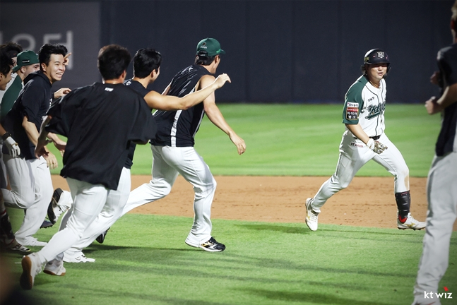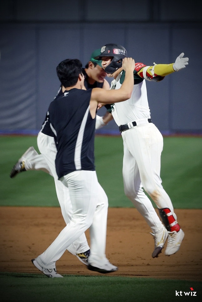 KT는 31일 수원KT위즈파크에서 열린 2025 신한 SOL Bank KBO 리그 정규시즌 KIA전서 7-6으로 이겼다. 4-6으로 패색이 짙었지만 9회 3점을 뽑아 경기를 다시 뒤집었다.