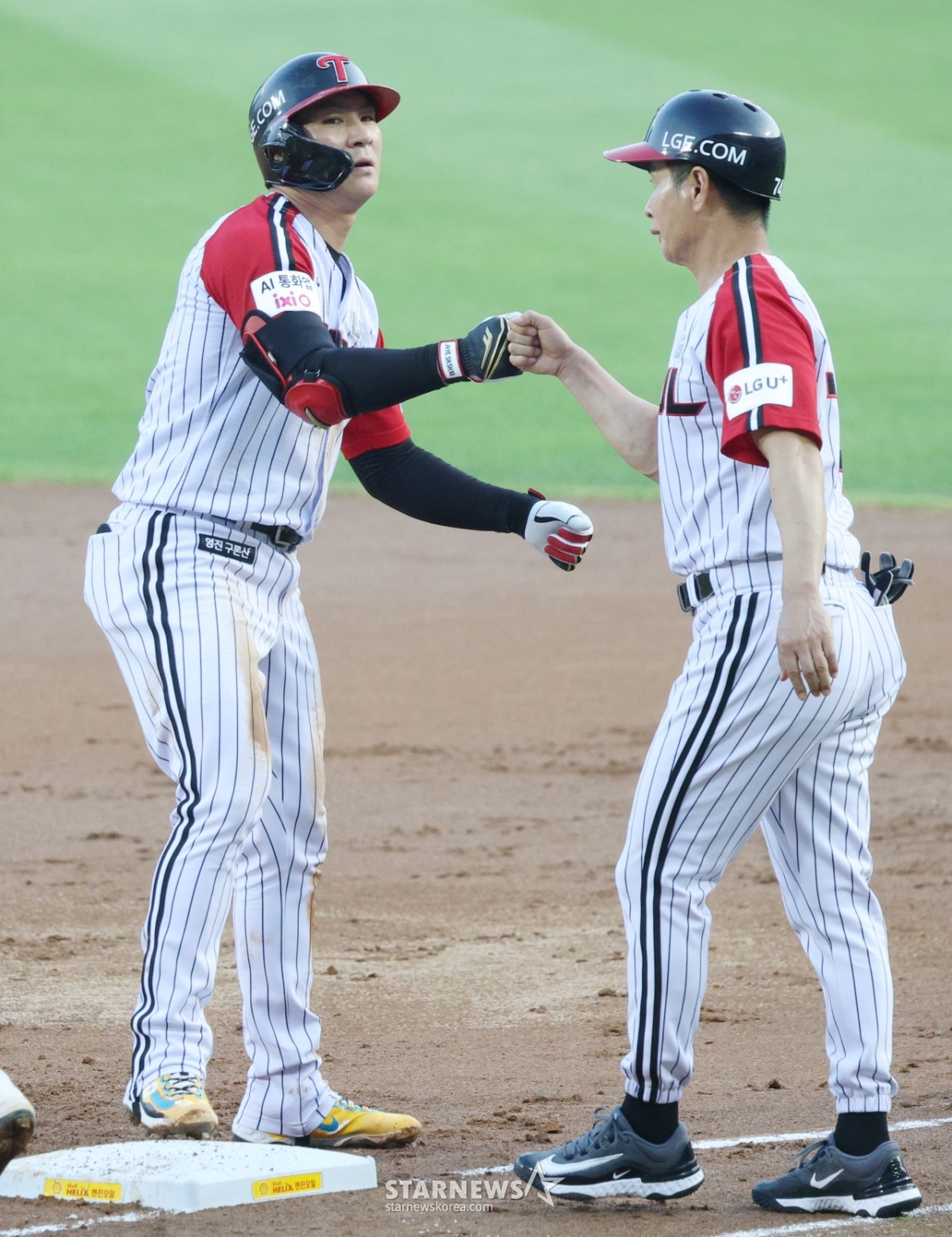 스포츠야구[포토] 오지환 '행운의 동점타'발행 : 2025.08.31 ・ 18:51잠실=김진경 대기자2025 신한 SOL Bank KBO리그 LG 트윈스 대 키움 히어로즈 경기가 31일 서울 잠실야구장에서 열렸다.LG 오지환이 2회말 2사 3루에서 동점 1타점 적시타를 날리고 출루한 후 송지만 코치의 환영을 받고 있다.<저작권자 © 스타뉴스, 무단전재 및 재배포 금지>프로야구KBO시구승요승리요정치어리더추천 기사김진경 대기자기자홈좋아요 스포츠-야구의 인기 급상승 뉴스스포츠-야구의 최신 뉴스