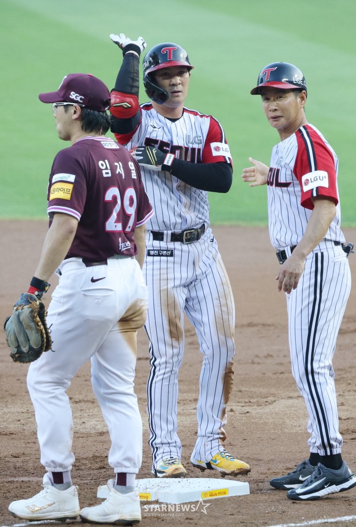 스포츠야구[포토] 오지환 '행운도 실력이다'발행 : 2025.08.31 ・ 18:52잠실=김진경 대기자2025 신한 SOL Bank KBO리그 LG 트윈스 대 키움 히어로즈 경기가 31일 서울 잠실야구장에서 열렸다.LG 오지환이 2회말 2사 3루에서 동점 1타점 적시타를 날리고 출루한 후 송지만 코치의 환영을 받고 있다.<저작권자 © 스타뉴스, 무단전재 및 재배포 금지>프로야구KBO시구승요승리요정치어리더추천 기사김진경 대기자기자홈좋아요 스포츠-야구의 인기 급상승 뉴스스포츠-야구의 최신 뉴스