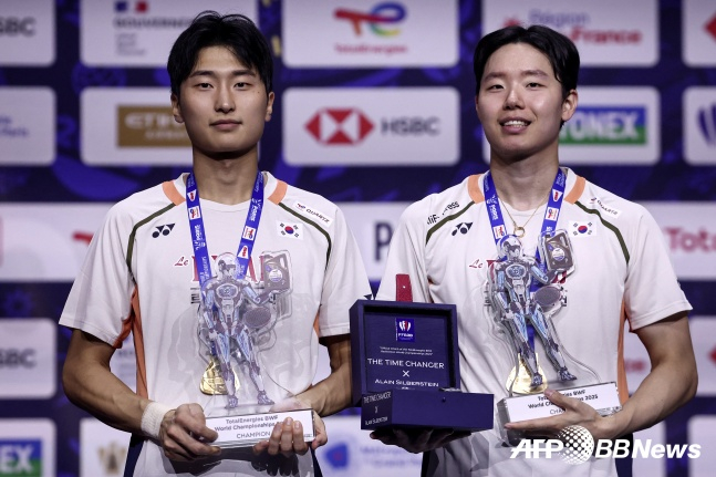 한국의 서승재·김원호 조는 1일(한국 시간) 프랑스 파리의 아디다스 아레나에서 열린 2025 세계개인배드민턴선수권 남자 복식 결승전에서 중국의 천보양-류이 조(11위)를 게임 스코어 2-0(21-17, 21-12)으로 제압했다.