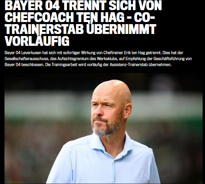 충격적인 경질이다. 바이어 04 레버쿠젠이 에릭 텐 하흐 감독을 공식 경기 불과 세 경기 만에 내쳤다.