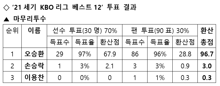 오승환은 투표에 참여한 선수 30명 중 29명(97%)으로부터 첫손에 꼽혔고 팬들에게서도 96%의 높은 득표율을 기록했다. 함께 후보에 오른 손승락(43)은 선수 투표에서 1표를 받았으며 이용찬(36·NC 다이노스)은 표를 얻지 못했다.