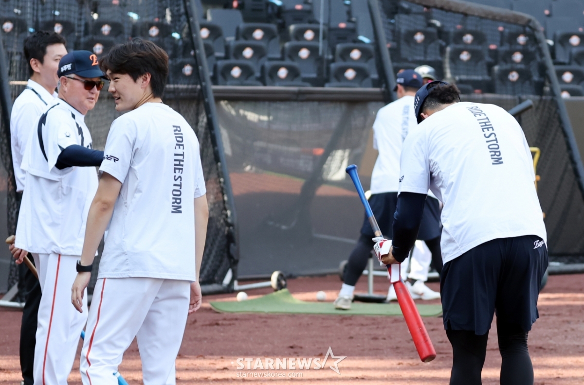 한화 외국인타자 리베라토가 2일 대전한화생명볼파크에서 열리는 2025KBO리그 한화이글스와 KIA타이거즈 경기에 앞서 훈련을 시작하던 중 김경문 감독에 인사를 하고 있다. 2025.09.02.