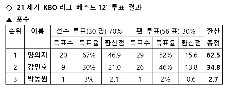 포수 부문에선 양의지가 1위에 올랐다. 양의지는 선수 30명 중 20명(67%)의 선택을 받았고, 팬 투표에선 52%를 얻어 환산 총점 62.5점으로 강민호(34.8점)를 제쳤다. 강민호는 선수로부터 9표(30%), 팬들에게선 양의지와 엇비슷한 46%를 득표했다. 선수 투표에서 희비가 갈린 셈이다. 또다른 후보 박동원(35·LG 트윈스)은 선수 1명의 지지를 받았다.