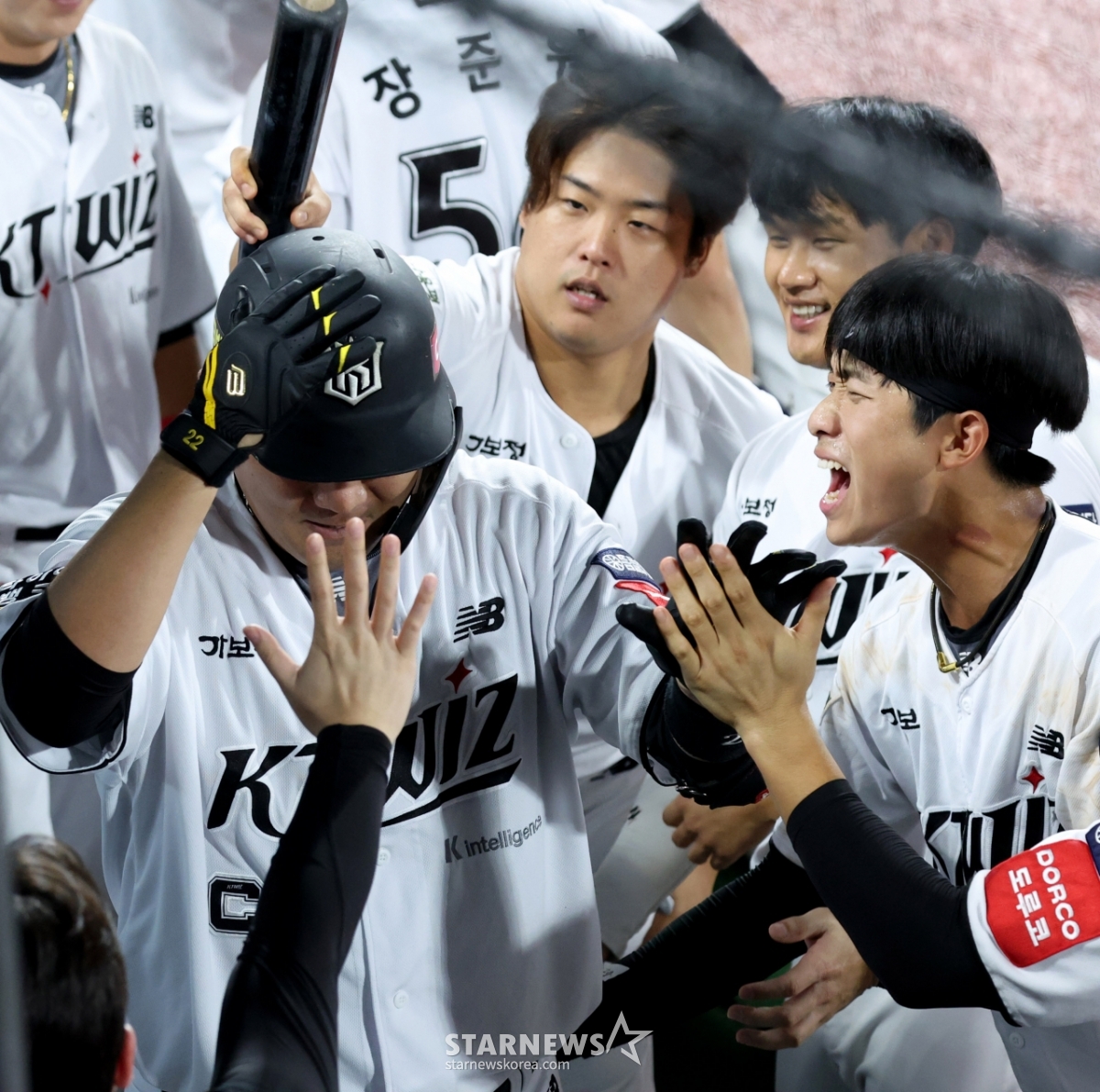 스포츠야구[포토] 장성우 '마이 무으따 아이가'발행 : 2025.09.03 ・ 20:17조회수 :수원=김진경 대기자2025 신한 SOL Bank KBO리그 KT 위즈 대 롯데 자이언츠 경기가 3일 수원 KT위즈파크에서 열렸다.KT 장성우가 5회말 무사에서 좌중월 1점 홈런을 날리고 홈인한 후 동료들의 환영을 받고 있다.<저작권자 © 스타뉴스, 무단전재 및 재배포 금지>브리핑추천 기사김진경 대기자기자홈좋아요스포츠-야구의 인기 급상승 뉴스스포츠-야구의 최신 뉴스AD
