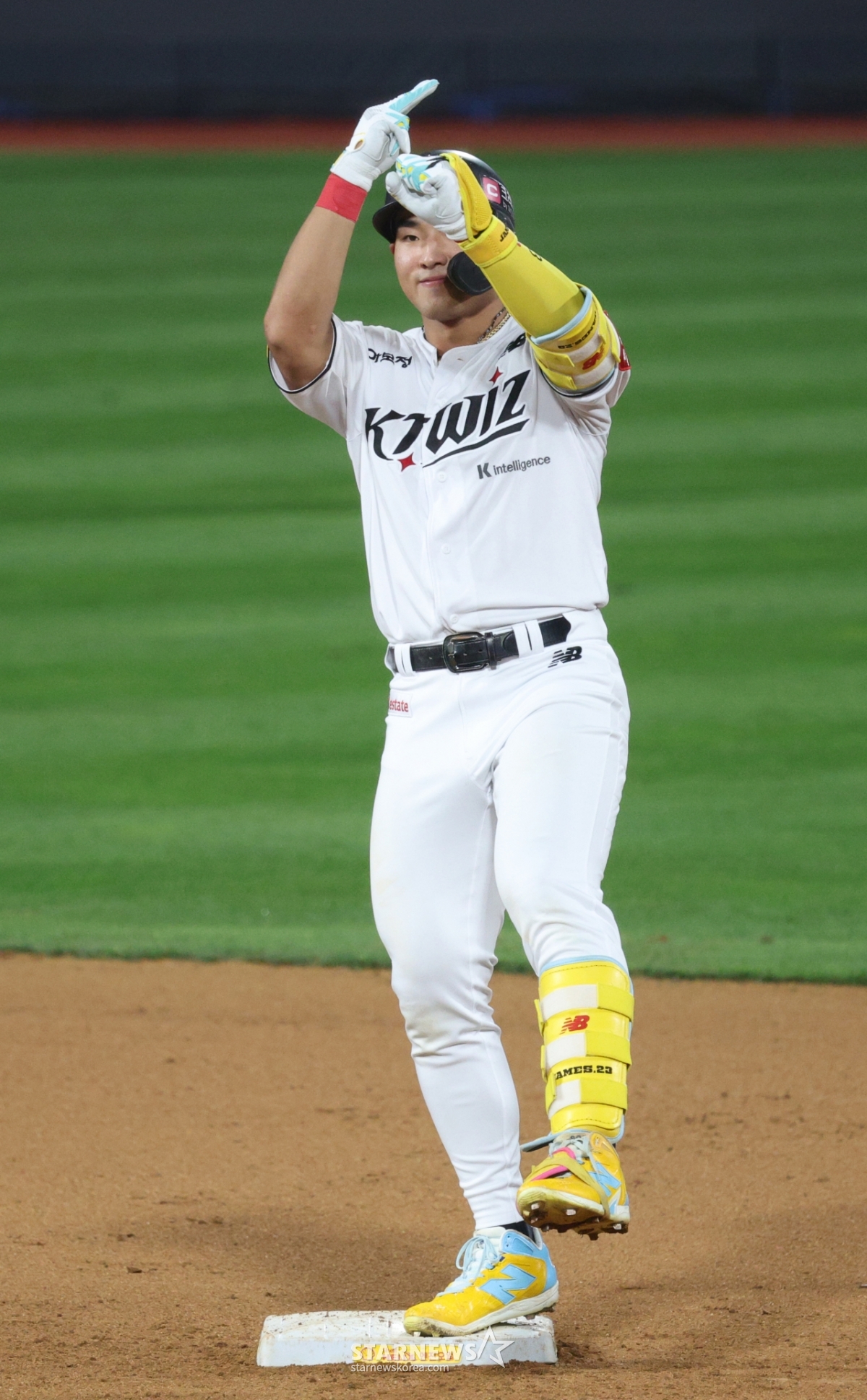 스포츠야구[포토] 춤추는 안현민, 이쯤 되면 쐐기타발행 : 2025.09.03 ・ 20:51수원=김진경 대기자2025 신한 SOL Bank KBO리그 KT 위즈 대 롯데 자이언츠 경기가 3일 수원 KT위즈파크에서 열렸다.KT 안현민이 6회말 2사 2루에서 1타점 적시 2루타를 날리고 출루한 후 세리머니를 하고 있다.<저작권자 © 스타뉴스, 무단전재 및 재배포 금지>프로야구KBO시구승요박세웅전준우추천 기사김진경 대기자기자홈좋아요 스포츠-야구의 인기 급상승 뉴스스포츠-야구의 최신 뉴스