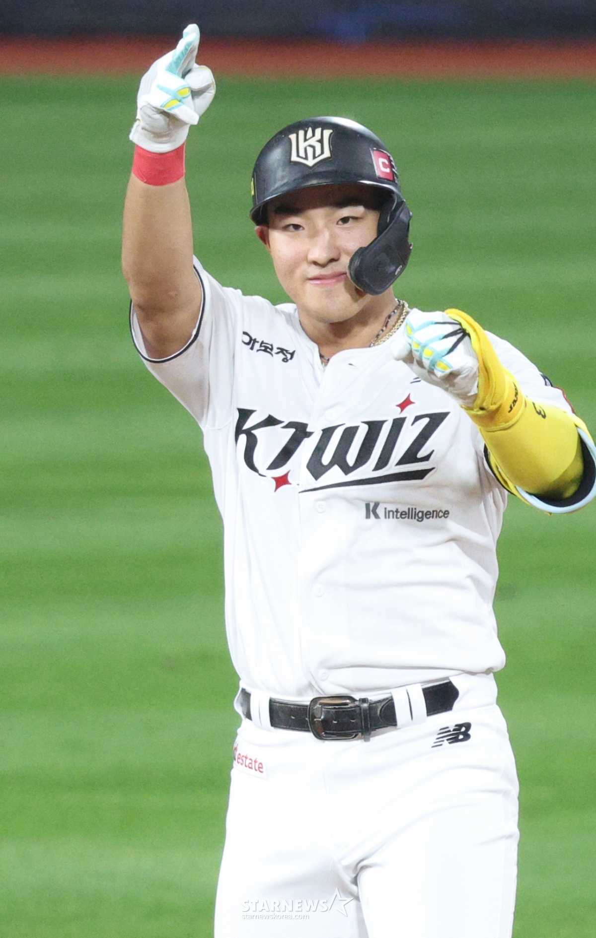 스포츠야구[포토] 안현민 '예비 신인왕의 세리머니'발행 : 2025.09.03 ・ 20:52수원=김진경 대기자2025 신한 SOL Bank KBO리그 KT 위즈 대 롯데 자이언츠 경기가 3일 수원 KT위즈파크에서 열렸다.KT 안현민이 6회말 2사 2루에서 1타점 적시 2루타를 날리고 출루한 후 세리머니를 하고 있다.<저작권자 © 스타뉴스, 무단전재 및 재배포 금지>프로야구KBO시구승요박세웅전준우추천 기사김진경 대기자기자홈좋아요 스포츠-야구의 인기 급상승 뉴스스포츠-야구의 최신 뉴스